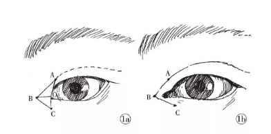 切口设计⑴B点设在瞳孔中央与鼻背中线间水平连线中点的稍下方,此点为术后新的内眦点;⑵重睑线在内眦边缘消失处与睑缘的交点设为A点;⑶内眦赘皮与下睑的交点设为C点;⑷将上述3点连线成三角形ABC;⑸由B点向瞳孔下缘画一水平线,找到该线与蹼状边缘的交点,即为O点。